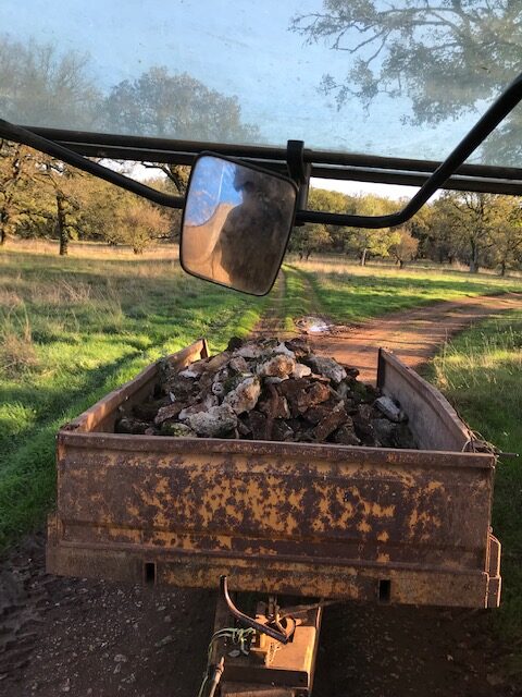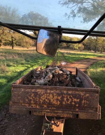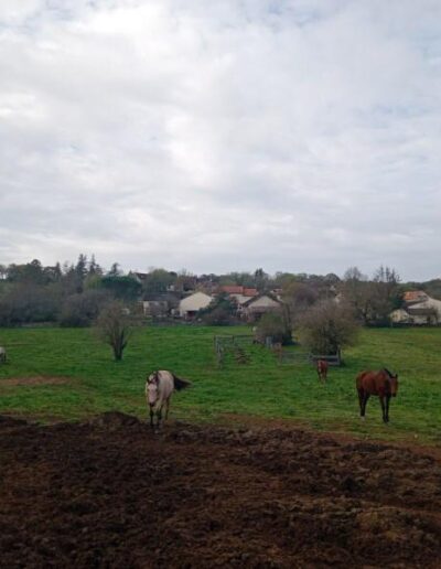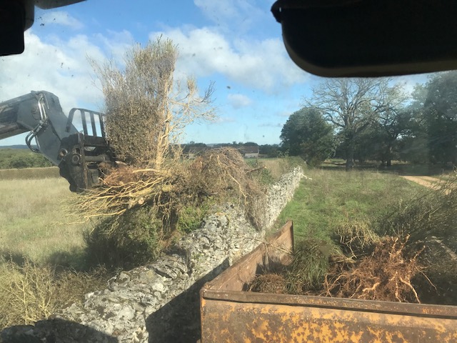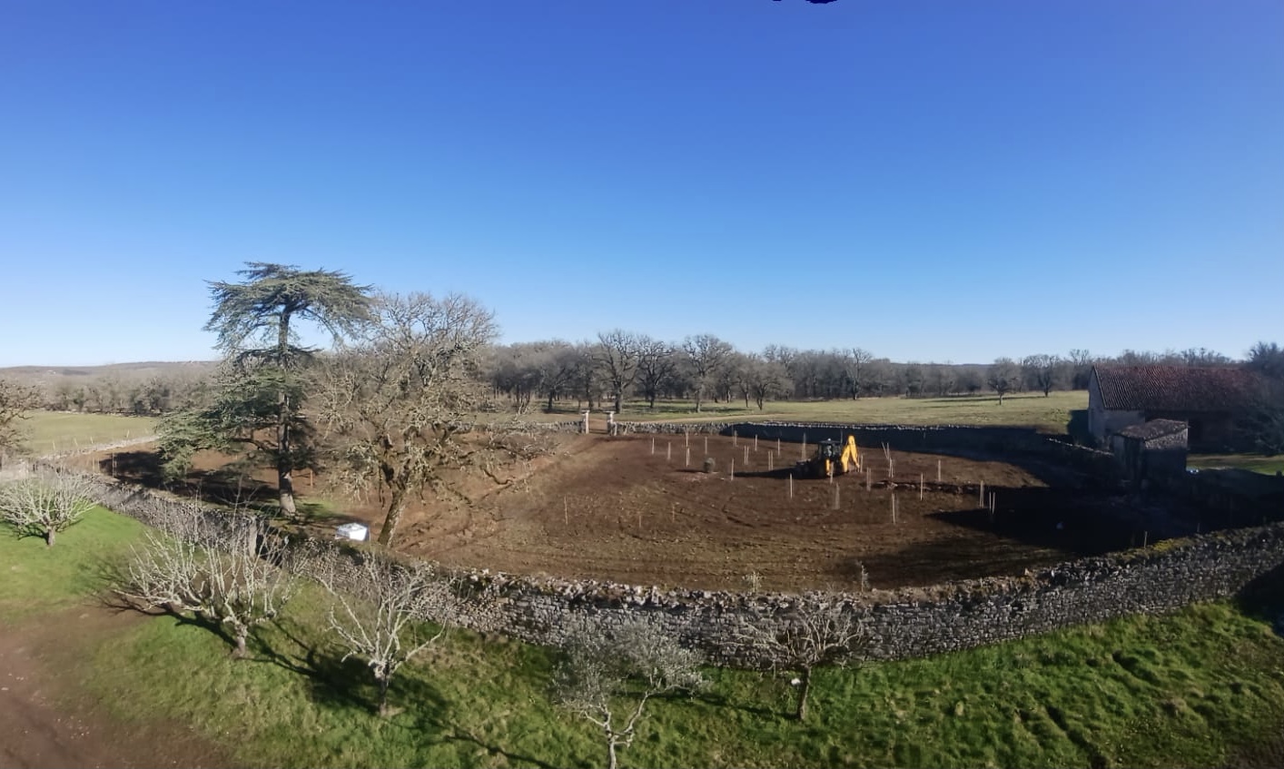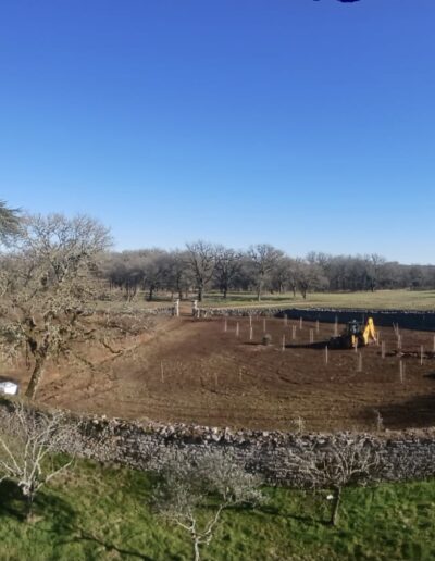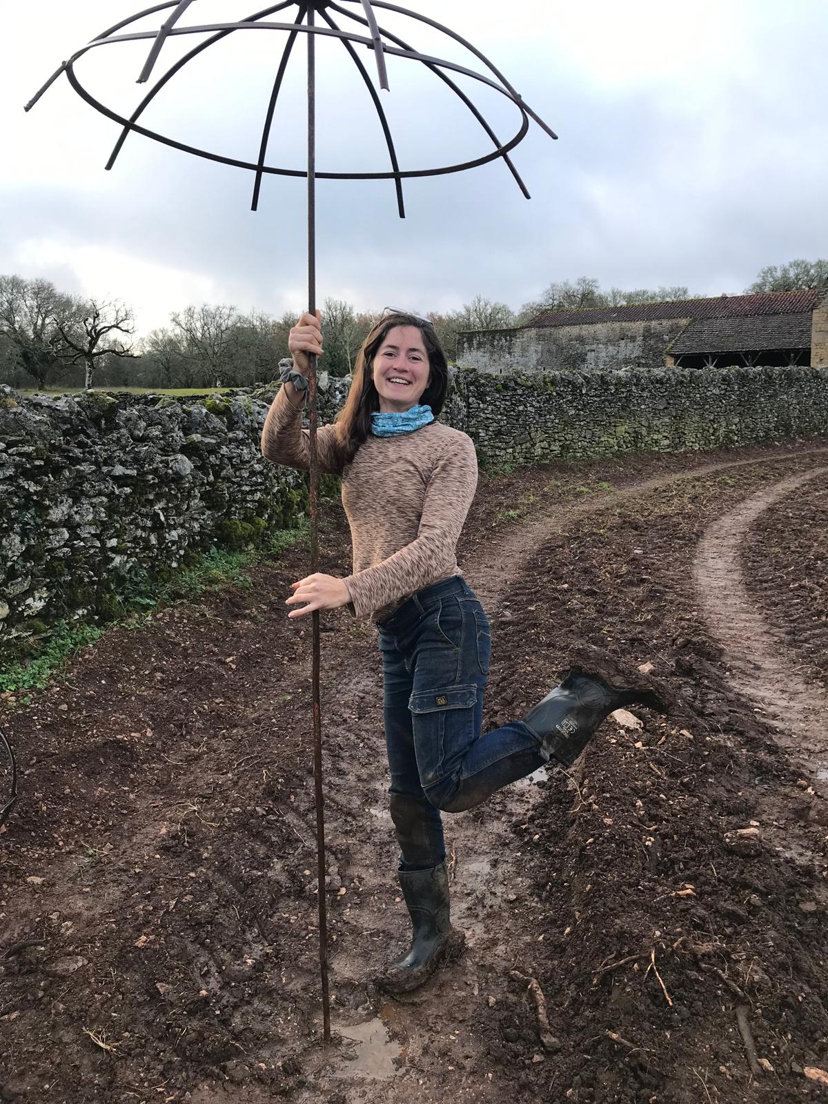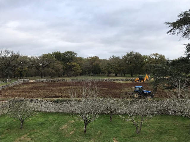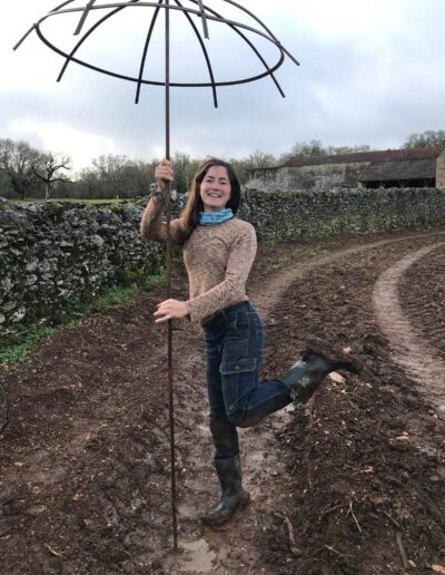 3 mois de chantier intense et d’expériences formatrices. Travaux préalables : retrait de 400ml de buis décimés par la pyrale (ah cette jolie chenille…), retrait de gros cailloux (ah le charme du Causse…). Amendement du sol au fumier de cheval et fumier de brebis. Travail superficiel du sol à la herse et aux disques pour décompacter et aérer le sol. Pralinage des scions de fruitiers achetés en racines nues (pralin maison sans noisettes). Plantations de 11 arbres, 48 arbres fruitiers, 67 arbustes, 42 grimpantes, 27 arbrisseaux / fleurs vivaces au total, aux intérêts comestibles, mellifères et nectarifères, brise-vent, fixateurs d’azote (Fabaceae), médicinaux et sensoriels. Des manchons anti-écorçage respirant et le tuteurage des scions ont été nécessaires. La tonte des brebis caussenardes sera recyclée en paillage organique au pied des arbres au printemps. Ce fut une expérience très enrichissante sur tous les plans, pas de tout repos mais Lisa a tout de même trouvé le temps de danser sous la pluie, avec une terre amoureuse de ses bottes 🙂